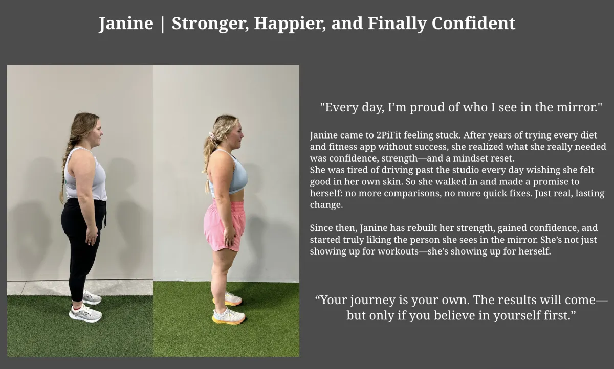 Janine came to 2PiFit feeling stuck. After years of trying every diet and fitness app without success, she realized what she really needed was confidence, strength—and a mindset reset.