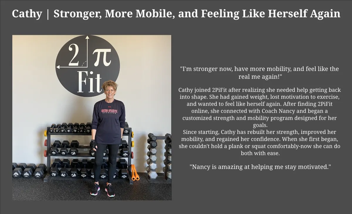 Cathy joined 2PiFit after realizing she needed help getting back into shape. She had gained weight, lost motivation to exercise, and wanted to feel like herself again. After finding 2PiFit online, she connected with Coach Nancy and began a customized strength and mobility program designed for her goals.