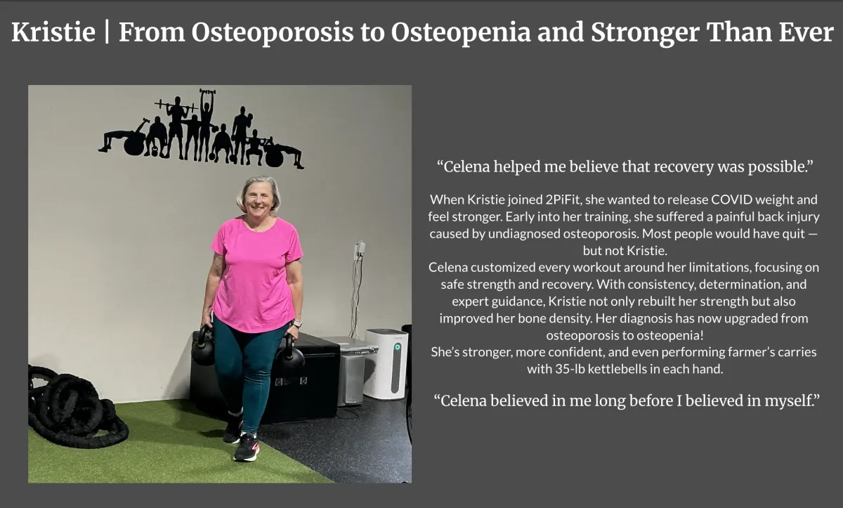 Celena customized every workout around her limitations, focusing on safe strength and recovery. With consistency, determination, and expert guidance, Kristie not only rebuilt her strength but also improved her bone density. Her diagnosis has now upgraded from osteoporosis to osteopenia!