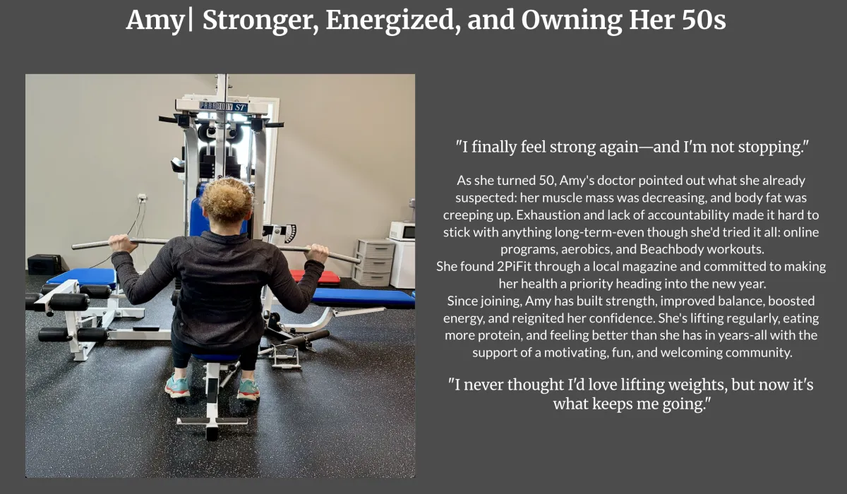 Since joining, Amy has built strength, improved balance, boosted energy, and reignited her confidence. She’s lifting regularly, eating more protein, and feeling better than she has in years—all with the support of a motivating, fun, and welcoming community.